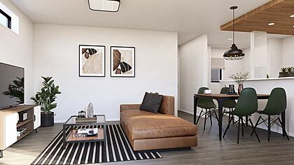 キッチンのポップアップ天井が映えるLDKのイメージ画像です。