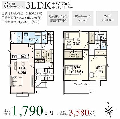 参考プラン、全室フローリング、玄関ホールにSC、1階廊下に2WayのWIC、家事動線の良い、LDK16帖、キッチン脇にパントリー収納、2階ワイドバルコニーに面した洋室7.75帖にWICございます。
