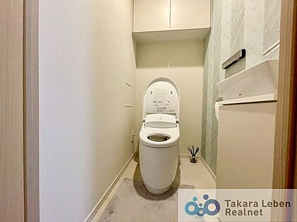 ウォシュレット機能付きのトイレは壁掛けリモコンの上位グレードを採用。便座がスッキリした印象となり、限られた空間を広く見せる効果があります。