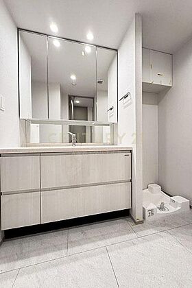 洗面化粧台/新規交換済、三面鏡収納に加え下部収納もあるので嵩張る小物類もすっきりと収納が出来ます。