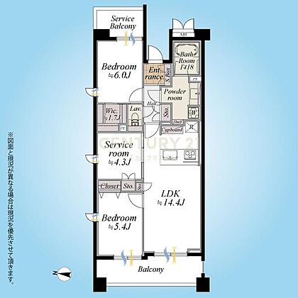 間取図/4階部分西・北・東3方角住戸2SLDK+Wic、内装リノベーションにより室内設備一新、新築同様にお住まいいただけます。室内を広く使えるアウトフレーム工法です。