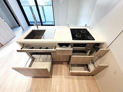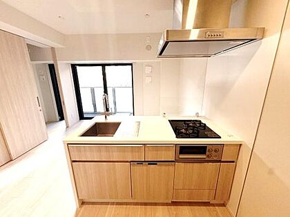 お料理のしやすい広さの木の温かみあるデザインのキッチン。2口コンロ・食洗機付で使い勝手◎十分なキッチン収納があり、キッチンまわりを綺麗に使用できます♪