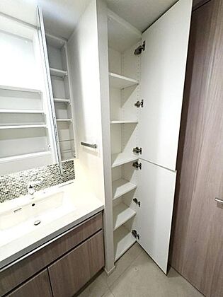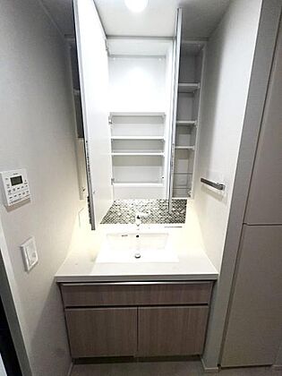 鏡が大きく使い勝手の良いゆとりの広さの三面鏡付洗面台。大容量の収納があり、洗面まわりを綺麗に使用できます!水まわりが集中している事によって移動距離が短くなるので家事効率がUP!