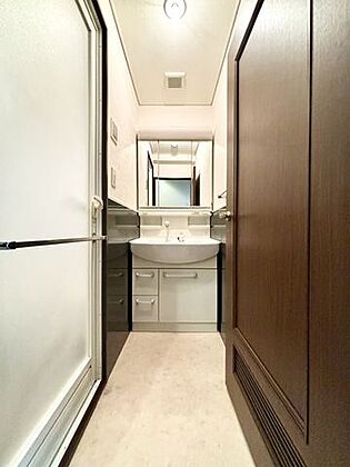 洗面室には三面鏡付きの洗面化粧台を設置。