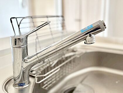 シンプルで使いやすいキッチン水栓。シャワーに切り替えもでき便利にお使いいただけます。
