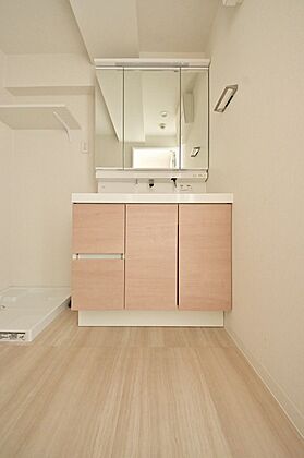 スッキリシンプルで使いやすい洗面台。3面鏡の裏側が収納になっており、小物もしまえます。