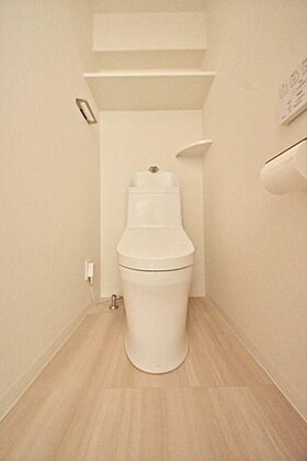 スイッチが壁付けでどなたでも使いやすいトイレ。温水洗浄便座つきで快適です。