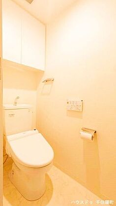【トイレ】タンク上に手洗いカウンターが付いた、機能的なトイレです。もちろん温水洗浄便座を完備。上部の吊戸棚には、トイレットペーパーや掃除用品などをすっきりと収納でき、空間を清潔に保てます。