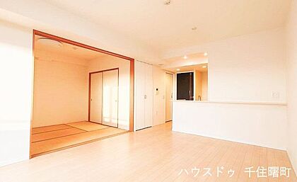 【リビングに隣接した和室は、安らぎの空間】引き戸を開ければリビングと一体の開放的な大空間!客間や寝室としてプライベートを確保もできます。お子様のプレイスペースや、ちょっとしたお昼寝の場所としても。