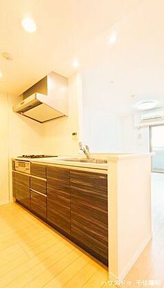 【キッチン】リビングにいる家族と会話を楽しみながらお料理ができる、人気の対面式カウンターキッチン。美しい木目調のデザインが空間のアクセントに。収納も豊富で、使い勝手の良い設計です。