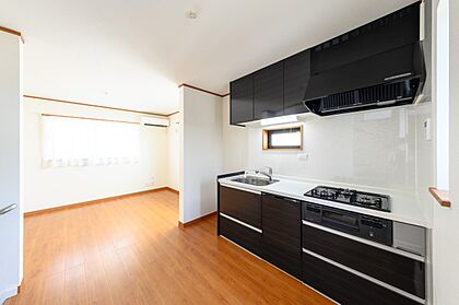 【キッチン】三口コンロで料理の幅を拡げてくれる使いやすいシステムキッチンを採用。洗い場も大きいので野菜や食器を洗ったりする際にも捗り、強い味方となってくれるはずです。