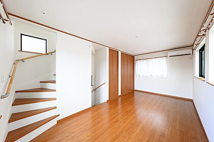 【手すり付階段】手すりがないと階段の昇り降りで危険なことはもちろん、壁に手をつきながら歩くことで壁紙が汚れやすくなります。快適な暮らしに今の時代手すりは常識です。