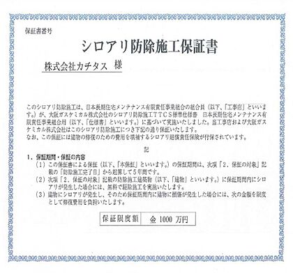 シロアリ防除には5年間の保証付き(施工日から。施工箇所のみ施工会社による保証)。