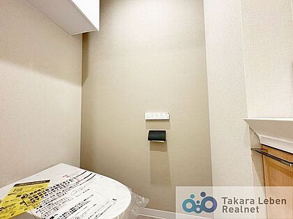 ウォシュレット機能付きのトイレは壁掛けリモコンの上位グレードを採用。便座がスッキリした印象となり、限られた空間を広く見せる効果があります。