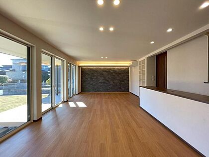 広々芝生庭・ウッドデッキに面した、広々31帖LDK!大きな窓から陽光が注ぐ明るい空間です。