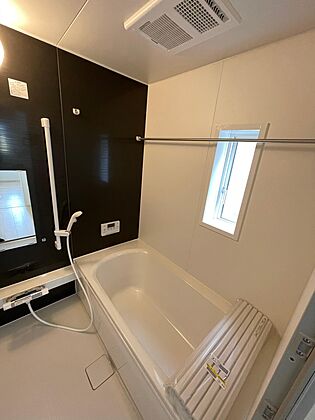 床の乾きやすい1坪タイプの浴槽♪足を伸ばしてゆっくり入浴♪浴室暖房機能付きで冬でもあたたかいです。また乾燥機能で洗濯物干しコーナーとしての用途も可能♪
