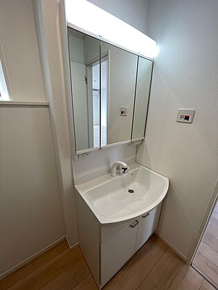 三面鏡の洗面台は鏡の裏が収納になっているため化粧用品がたっぷり入ります♪コンセント付きでドライヤーもすぐに使えます♪