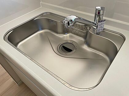 たっぷり食器が入るシステムキッチンのシンク♪シングルレバーなので片手で吐水できます♪蛇口部のヘッドホースが伸びて隅々まで行き渡ります♪浄水カートリッジ対応の水栓です♪