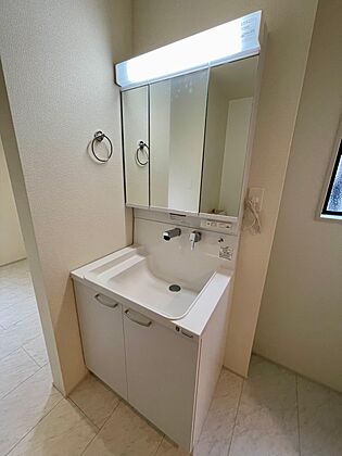 三面鏡の洗面台は鏡の裏が収納になっているため化粧用品がたっぷり入ります♪コンセント付きでドライヤーもすぐに使えます♪