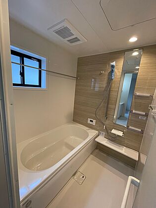 床の乾きやすい1坪タイプの浴槽♪足を伸ばしてゆっくり入浴♪浴室暖房機能付きで冬でもあたたかいです。また乾燥機能で洗濯物干しコーナーとしての用途も可能♪