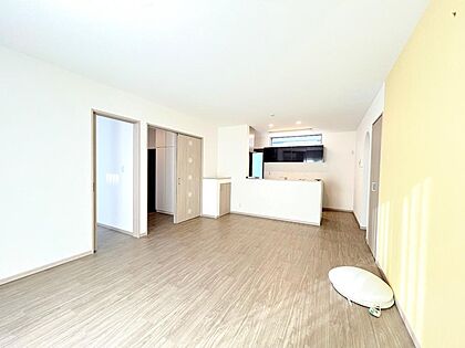 【リビング】リビング、キッチン側からのアングル写真です。レモンイエローの壁紙がアクセントとなりかわいいですね。