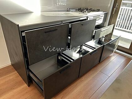 レンジ下やキッチンカウンターの下部は、奥までしっかり使えるスライド収納。