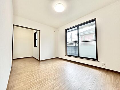 【リフォーム済】2階7.5帖洋室です。バルコニーに出られるお部屋です。床はクッションフロア張り、天井・壁のクロス張替え、照明交換を行いました。