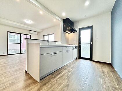 【リフォーム済】キッチンは幅約255cmと広々しています。対面キッチンです。