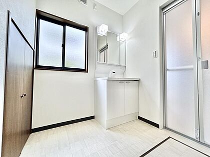 洗面化粧台は三面鏡タイプを採用しました。朝の支度がしやすく、見た目もすっきりします。