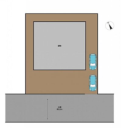 【区画図】縦列で駐車2台可能です。前面道路は約12mありますので、駐車やすれ違いがしやすいですね。