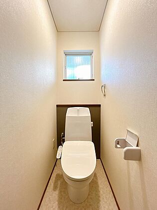 【リフォーム済】1階トイレ。新しい温水洗浄機能付きトイレに交換いたしました。直接肌に触れるところなので設備が新しいと気持ちいいですね。床クッションフロア張替、壁天井クロス張替を行いました。