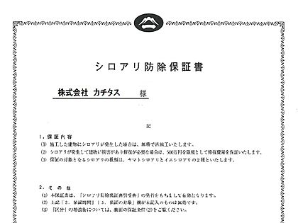 シロアリ防除には5年間の保証付き(施工日から。 施工箇所のみ施工会社による保証)。さらに計2回 の無料点検もあります。