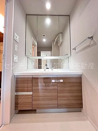 【洗面所】三面鏡の独立洗面台となっております。ストックなどを収納するのに便利な収納棚もございます◎