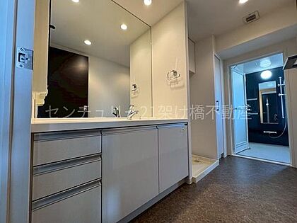 【洗面所】独立洗面台となっております。洗面台左手にはストックなどを収納するのに便利な収納棚もございます◎