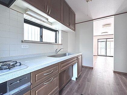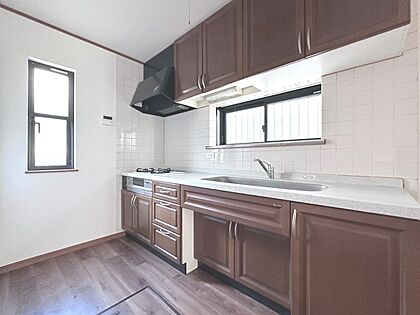 作業スペースを多くとったキッチン。夫婦そろってキッチンに立っても調理がしやすくゆとりある広さ。食器類もすっきりと片付く収納力が期待できます。家事をしながら会話も弾みます。
