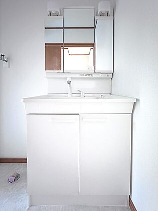 【三面鏡洗面化粧台】 ミラーを手前に引けば、楽な姿勢で髭剃りやメイクができます。合わせ鏡にすればヘアスタイルのチェックもラクラク。洗面化粧台のミラー裏にはたっぷり入る収納スペースを設けてい…