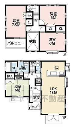 約6帖の和室含む4LDK。LDK広々18帖。3面採光^^玄関上部は吹き抜けで明るく開放感のある空間^^全居室ゆとりのある6帖以上、収納スペース付き^^