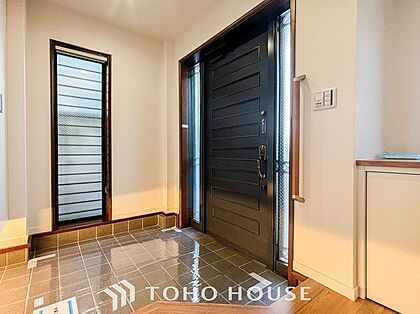 明るくコントラストのある、開放感と清潔感を兼ね備えた玄関。