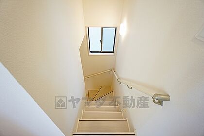 •  同仕様写真。小さなお子様やご高齢の方でも安心できる、手すり付き階段。段差も低めで設定されており、安全性にも優れています。