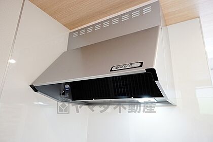 •  同仕様写真。風量が弱・強と切替え可能なレンジフードが調理中の煙をしっかり吸い込みます。手元を照らすライト付きです。
