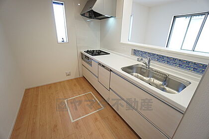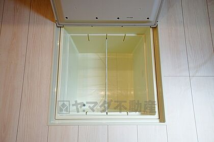 •  同仕様写真。キッチンにある床下収納は、居住スペースを減らさずに買い置きの調味料や非常食などを保管することができます。