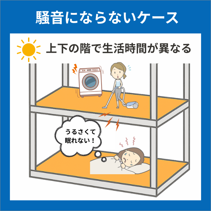 たとえば夜勤明けの人にとっては、昼間に子供がはしゃぐ声や掃除機がけの音がうるさいと感じることもあるでしょう。しかし、各々が活動する時間の違いによって周囲の「生活音」を騒音だと感じている場合は、苦情があってもほとんどのケースで問題視されません。