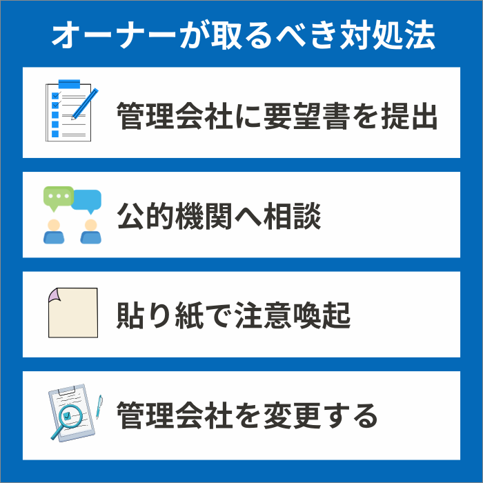 しかし管理会社にも対応できる範囲と限界があり、オーナー自身にも改善に向けた対処が求められます。