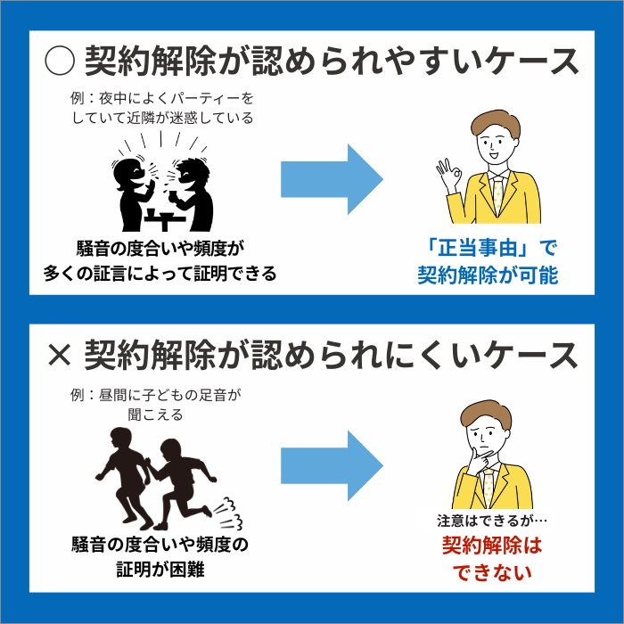 たとえば、「周辺一帯に響くような音量で深夜に音楽を流している」といった騒音トラブルのケースがあったとします。このときに音の大きさや時間帯、頻度が近隣住民の証言や証拠によって立証でき、限度を超える迷惑行為と認められた場合は、「正当事由」による契約解除を言い渡せる可能性があります。
