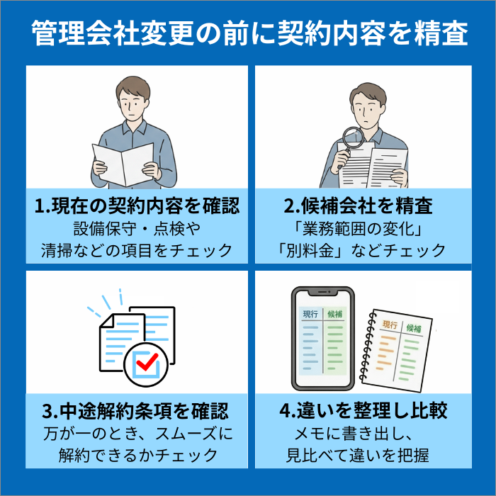 現在の管理会社の契約内容と、候補となる管理会社の契約内容の具体的な違いを書面で把握しておくと、変更後のトラブルを防止できます。